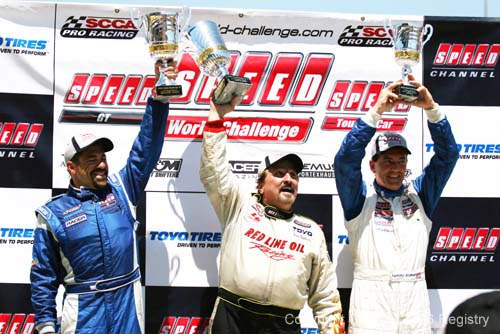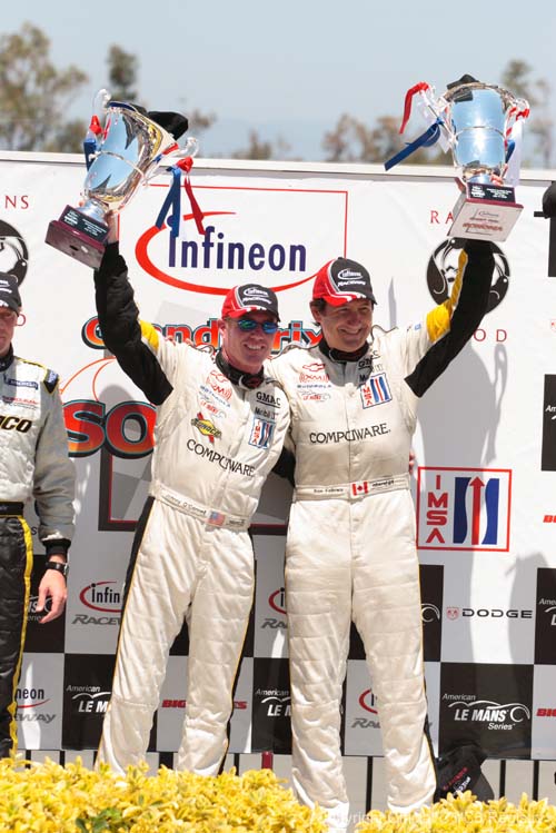 O'Connel and Ron Fellows celebrate their win on the podium.